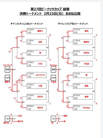 <最終結果>決勝トーナメント優勝:幸チェリーズ、準優勝:横須賀シーガルズAMY、3位:エスペランサガールズ、4位:北区さくらガールズ、チャレンジトーナメント優勝:FC RIGAR AZAREIA、準優勝:駒林SCローザ、3位:小柳まむし坂エリーゼ、4位:綾南FCガールズ