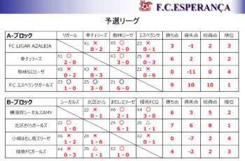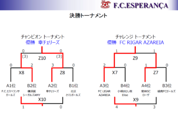 <最終結果>決勝トーナメント優勝:幸チェリーズ、準優勝:横須賀シーガルズAMY、3位:エスペランサガールズ、4位:北区さくらガールズ、チャレンジトーナメント優勝:FC RIGAR AZAREIA、準優勝:駒林SCローザ、3位:小柳まむし坂エリーゼ、4位:綾南FCガールズ